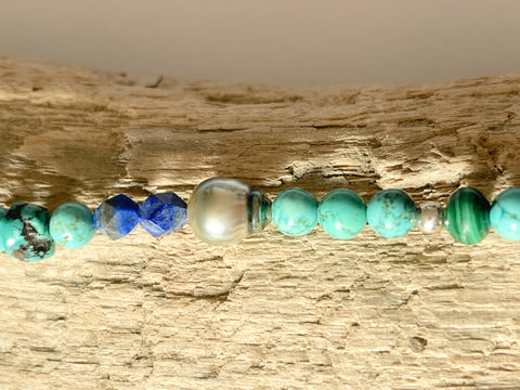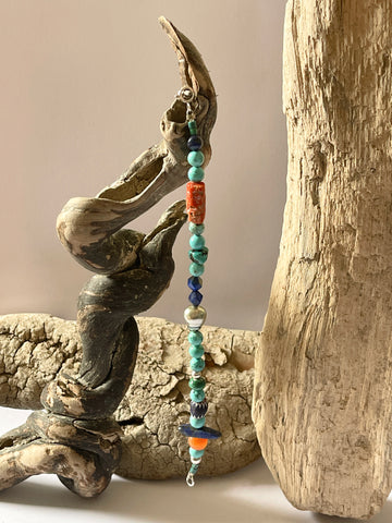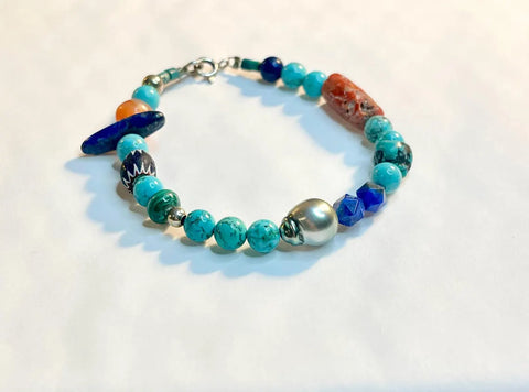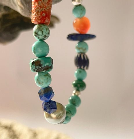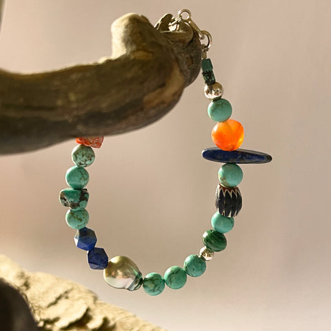 Bracelet dans les tons bleu turquoise, bleu foncé et rouge composé de matériaux exceptionnels comportant :