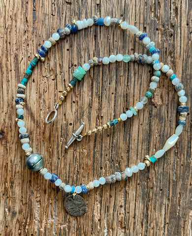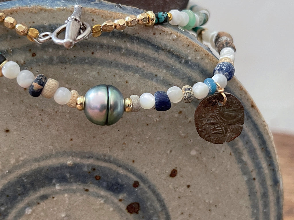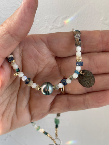 Pour répondre à sa teinte, j'ai utilisé des perles de verre romain antique dans les camaïeux de bleus et de beiges (ce sont les perles qui sont très patinées sur les photos),