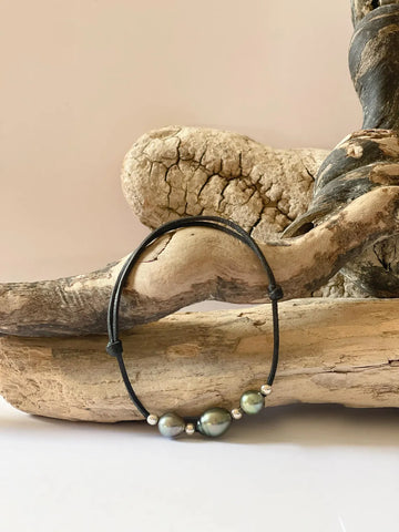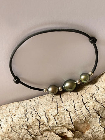 Jolies perles de Tahiti et perles rondes en argent 925 montées sur un cuir noir en provenance d'Australie. Le bracelet est ajustable grâce aux noeuds coulissants. homme ou femme