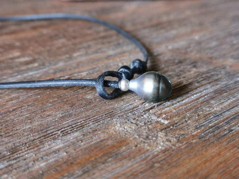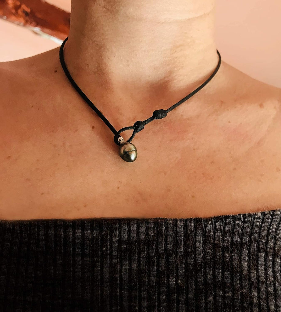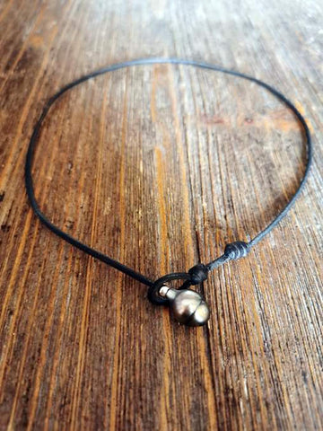 Perle de Tahiti gris clair (silver) montée sur un cuir australien, collier femme. Un design minimaliste à porter décontracté ou en soirée.