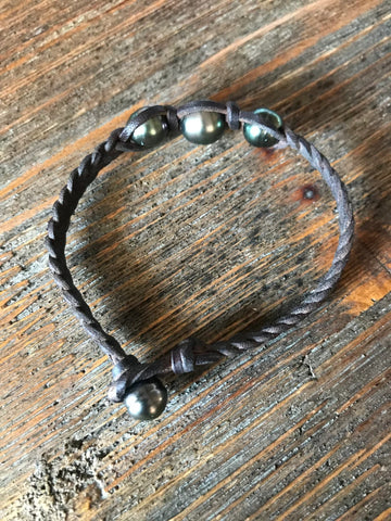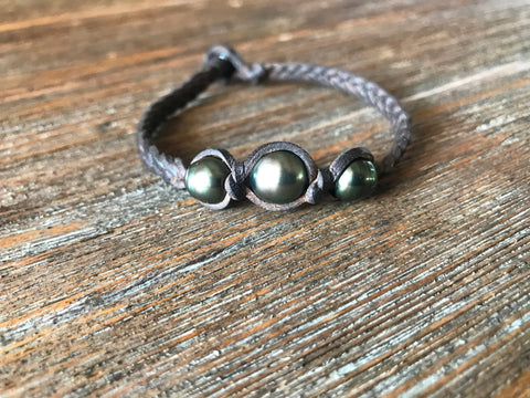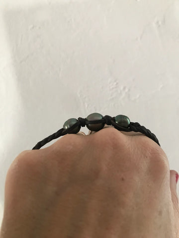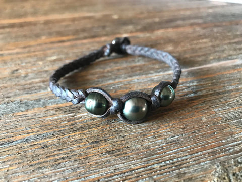 Perles de Tahiti montées sur un bracelet de cuir marron foncé australien pour homme ou femme.