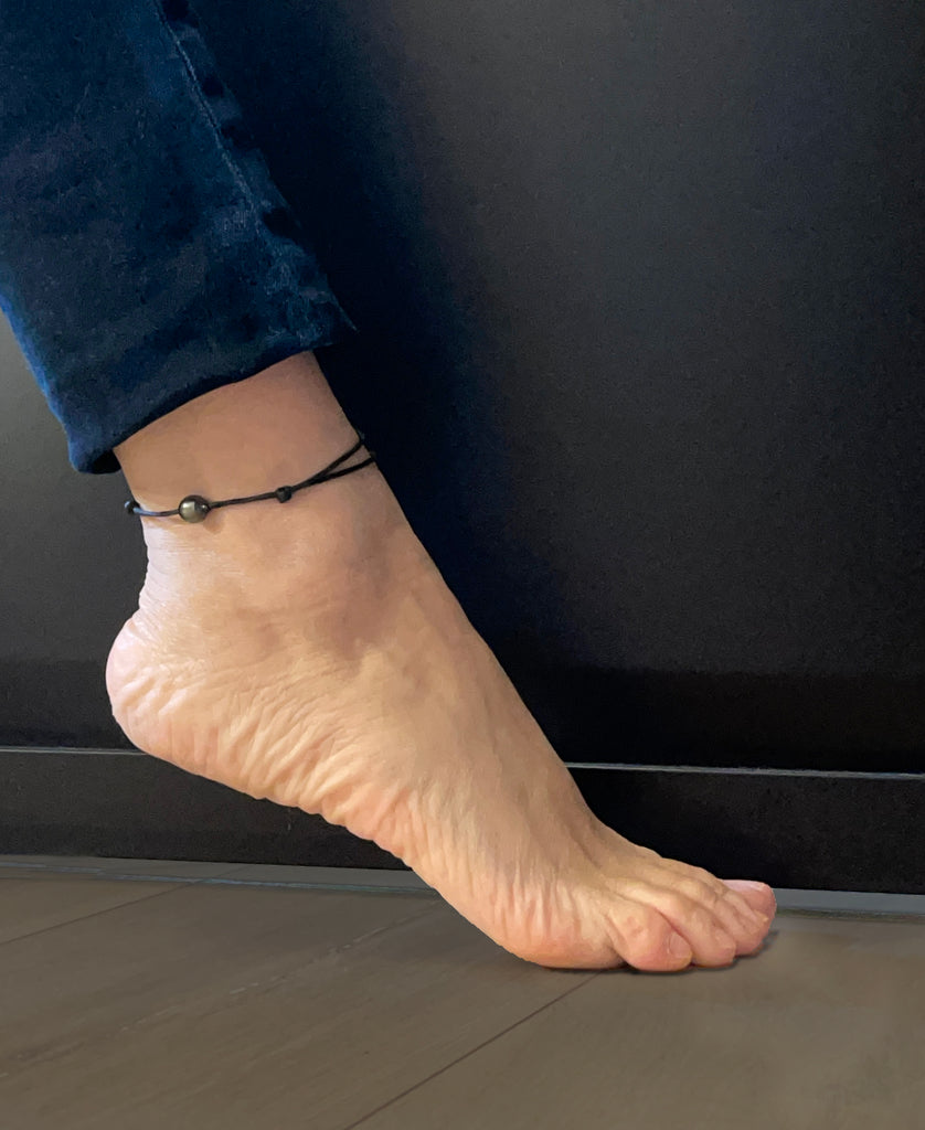 Belle perle de Tahiti montée sur un cuir australien. Bracelet de cheville femme, homme, adolescent.