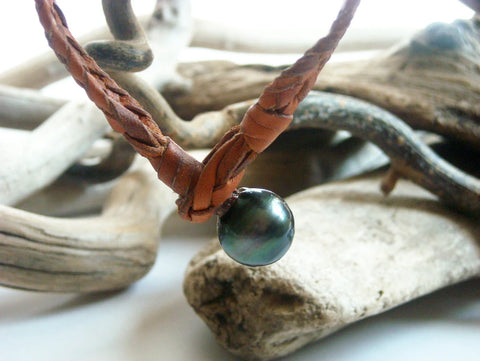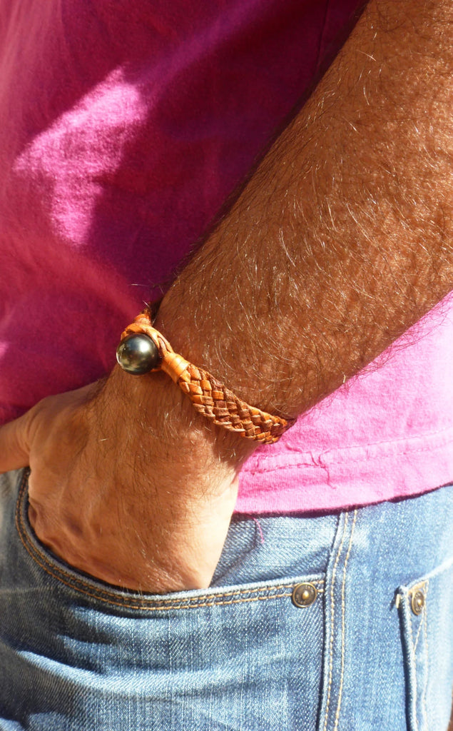 Bracelet pour homme, 7 brins de cuir tressés, une perle de Tahiti foncée semi-baroque cerclée, catégorie C, 12,5 - 13 mm de diamètre environ.